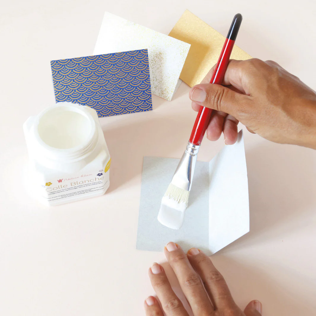 Cette colle devient transparente au séchage et a une prise lente qui permet de pouvoir retravailler son collage au besoin. Elle est prête à l’emploi et s’applique au pinceau pour encoller le papier.