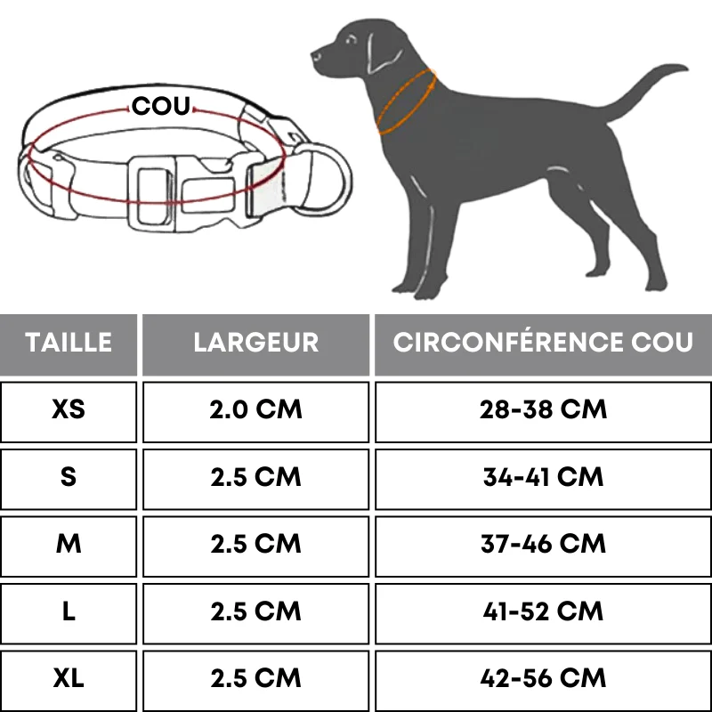Mesurez la circonférence du cou de votre chien. Dû à la mesure manuelle, prévoir une marge de 2 à 4 cm, afin de maintenir votre chien confortable.