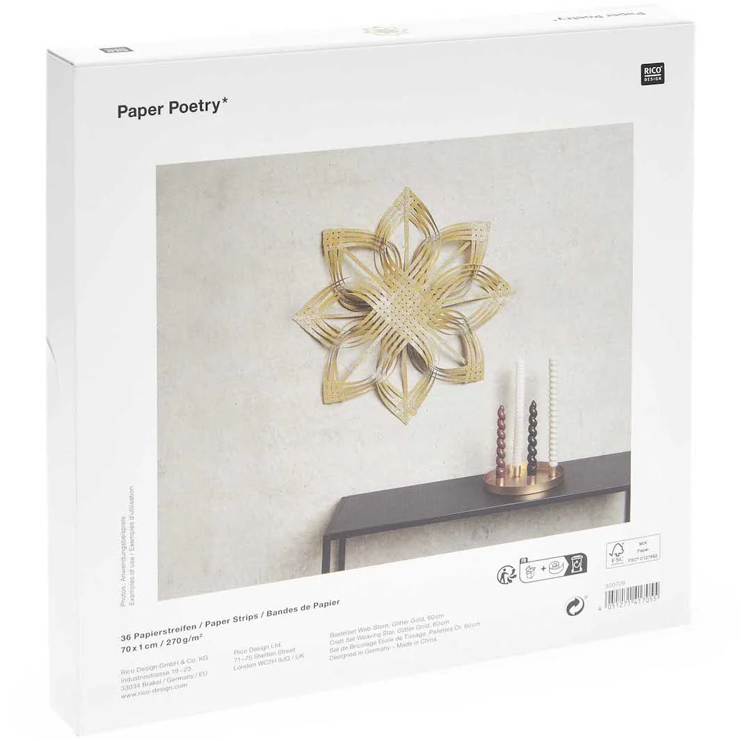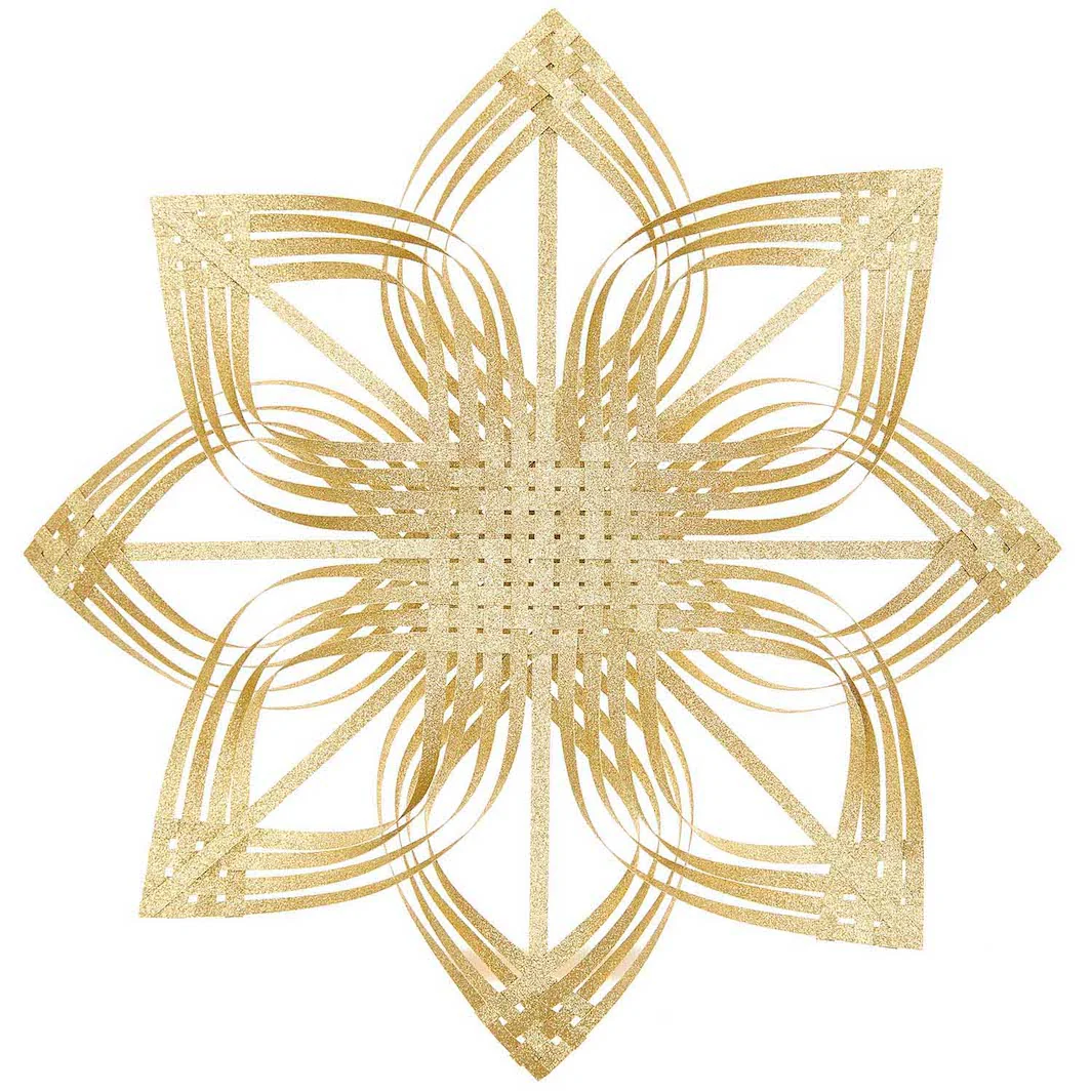 Ce set contient 20 bandes de papier et les explications nécessaires pour monter une jolie étoile de Noël à 8 branches de couleur dorée.