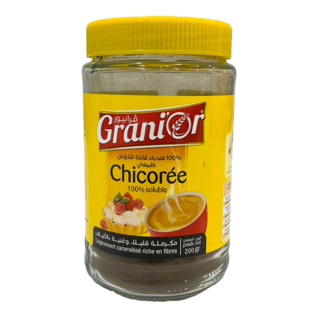 Découvrez le Granior Chicorée Café Solubles, un mélange harmonieux de chicorée et de café, proposé dans un format pratique de 200g.