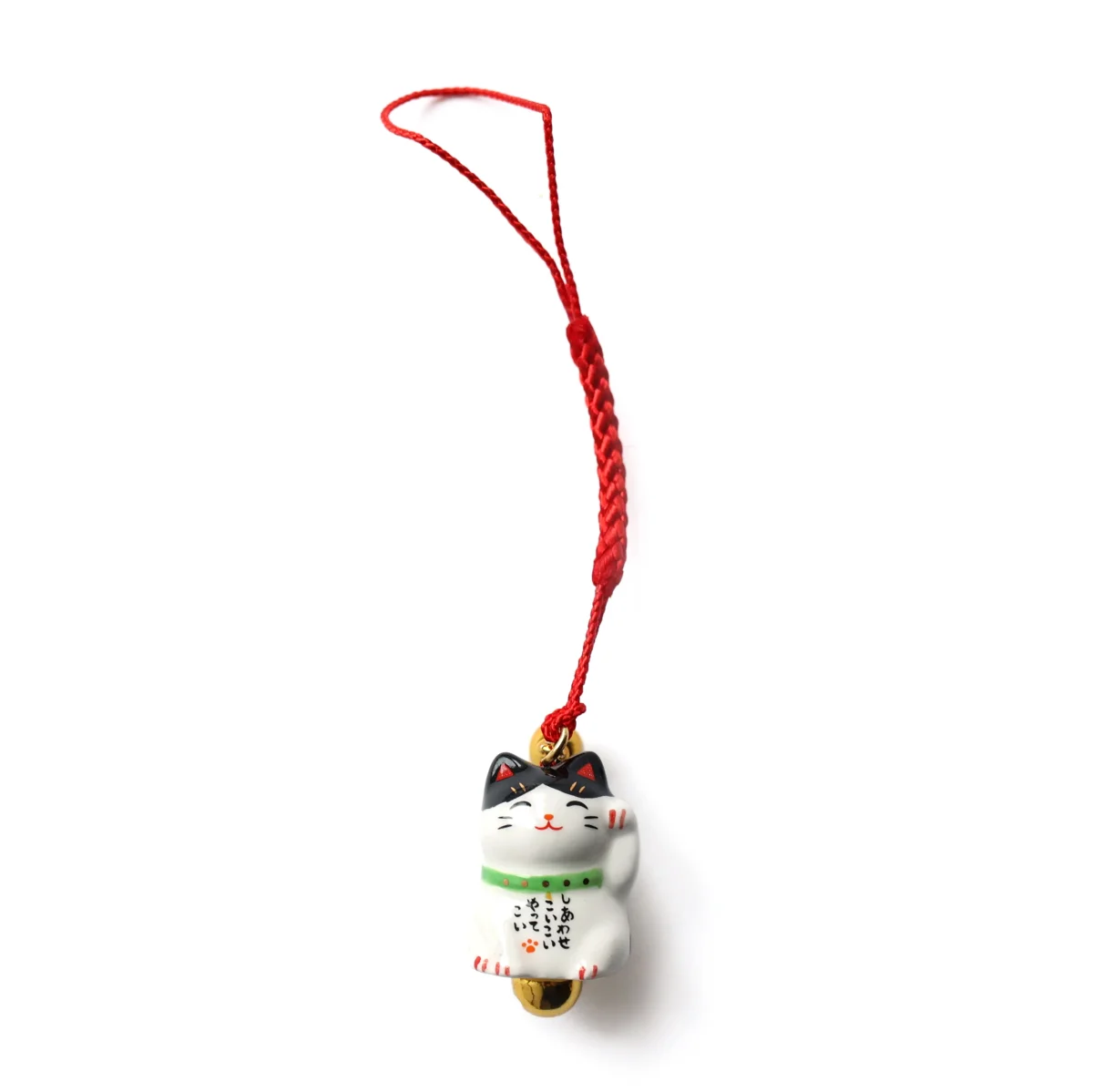 Emportez partout cet adorable grigri en forme de maneki-neko (porte-bonheur japonais en forme de chat, apportant la bonne fortune) au pelage blanc moucheté de noir.
