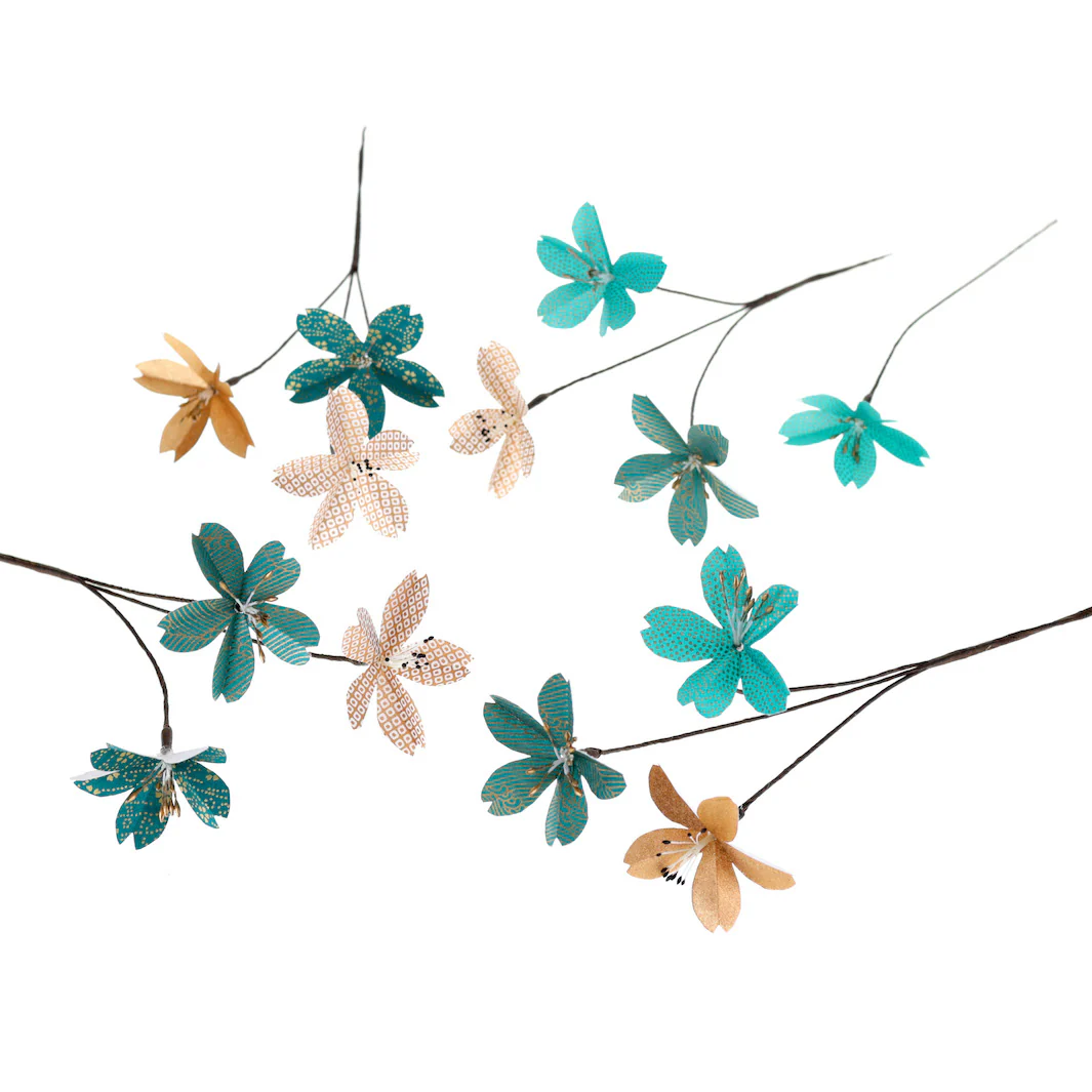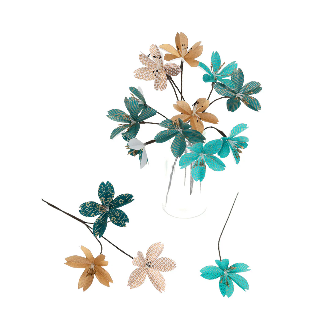 Ce kit créatif pour réaliser un joli bouquet de fleurs de cerisier, dans les tons bleu canard, blanc cassé, turquoise et dorés a été imaginé par Adeline.