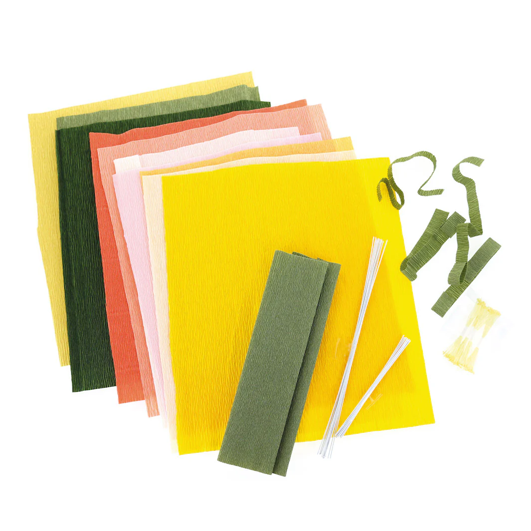 Ce joli kit créatif vous apprendra à réaliser un ravissant bouquet de 15 fleurs de jonquilles en papier crépon dans les tons jaunes, orange, corail et verts.