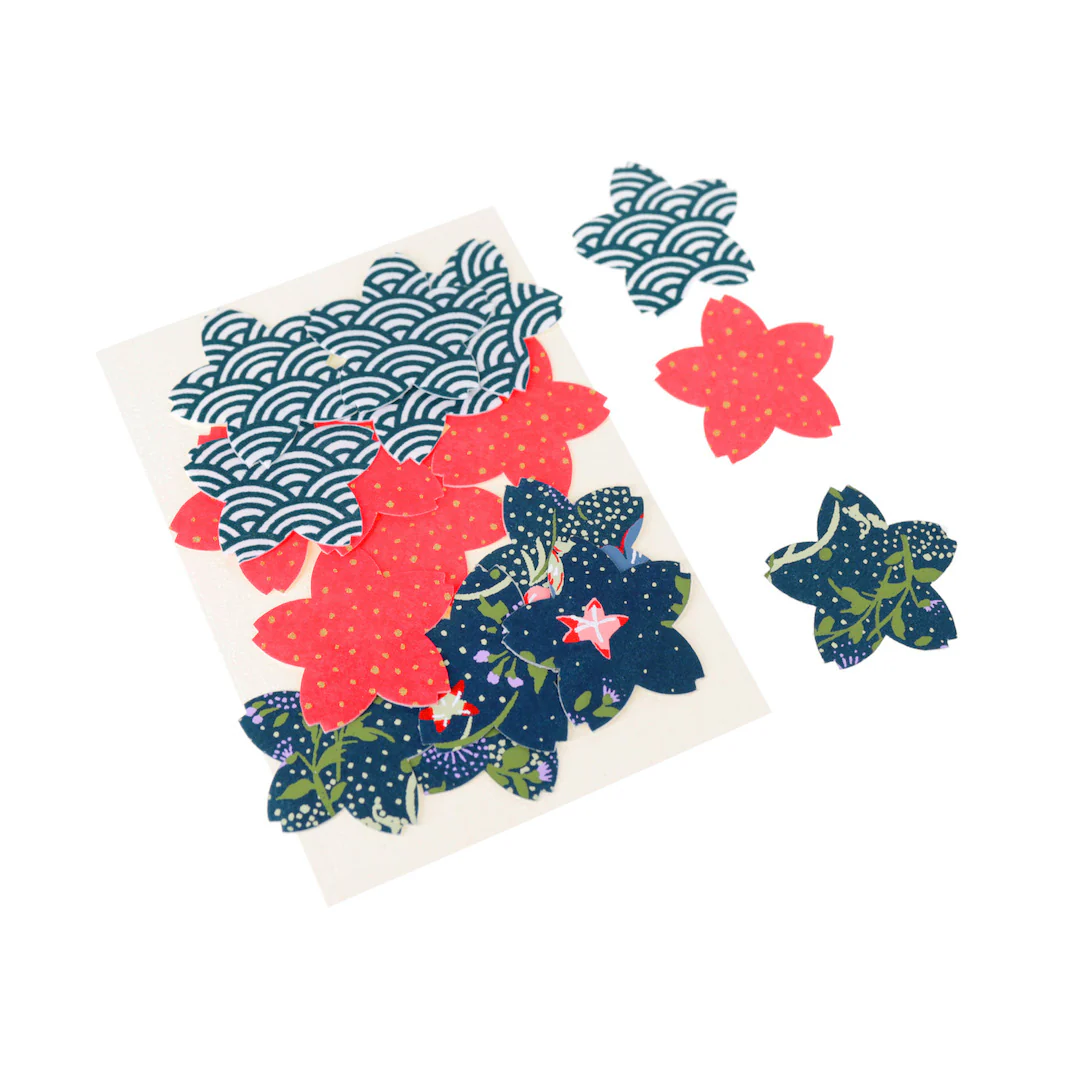 Ce lot contient 18 jolis autocollants en forme de fleurs de de cerisier (sakura) en papier japonais dans les tons bleu marine, rose rouge et verts.