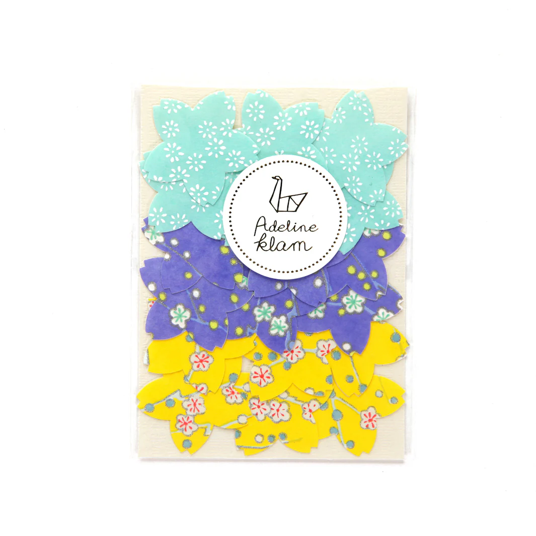 Joli lot de 18 stickers en forme de fleurs de de cerisier (sakura) en papier japonais dans les tons verts d’eau, violets et jaunes.