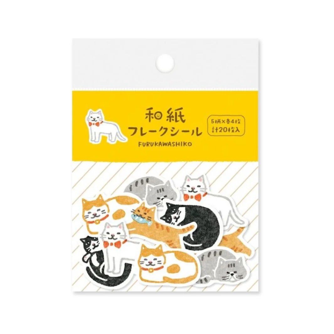 Ce lot contient 20 adorables autocollant en papier japonais (ou washi flakes), illustrés de chats aux poses et styles variés.