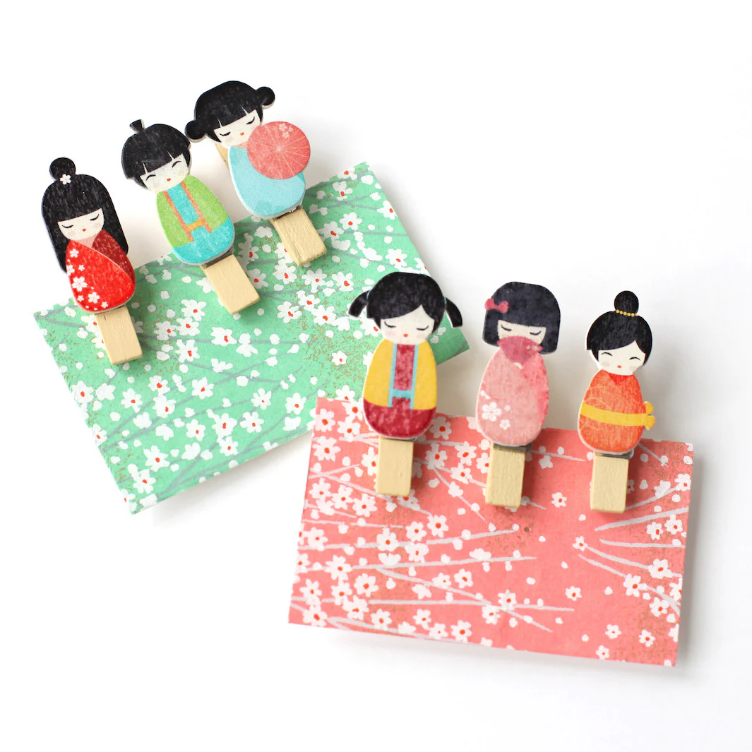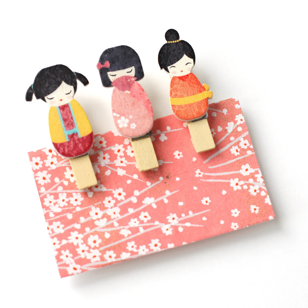 Lot de 3 pinces décoratives en bois en forme de kokeshi dans les tons chauds.