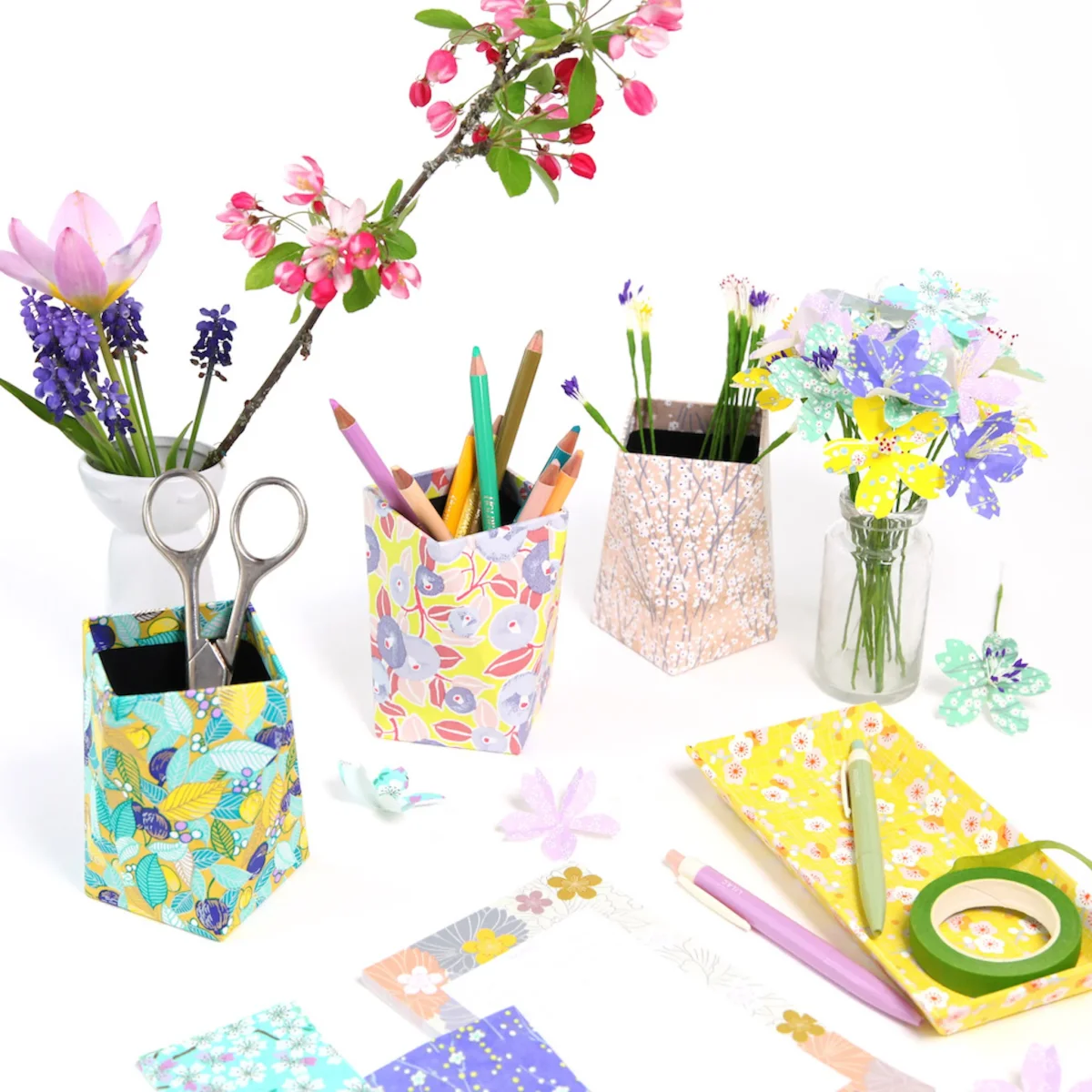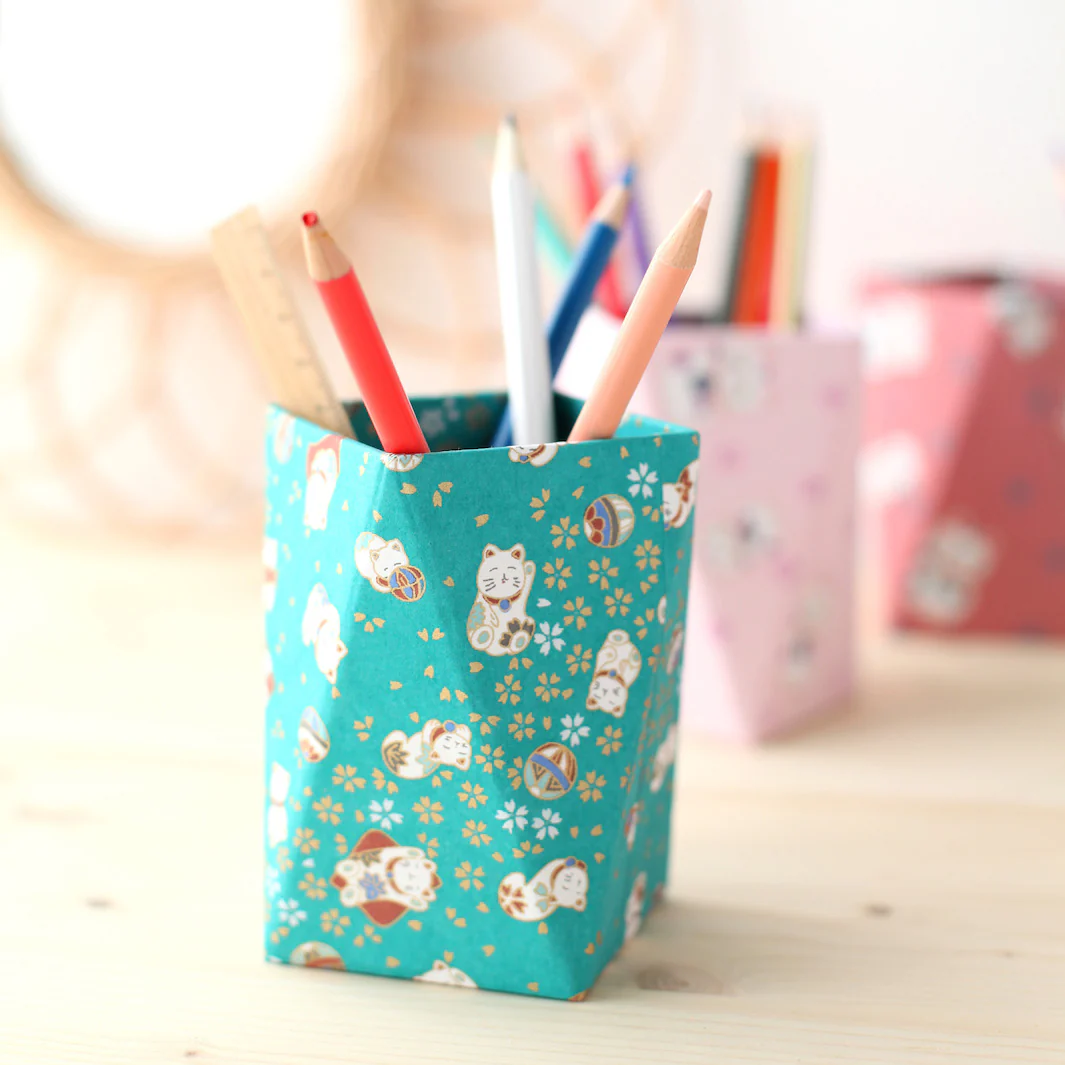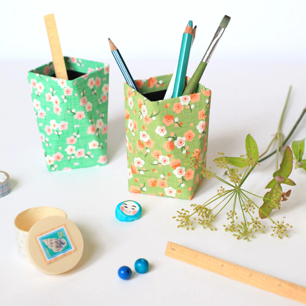 Grâce à 1 quart de feuille de papier japonais, vous pourrez customiser 63pots à crayons !