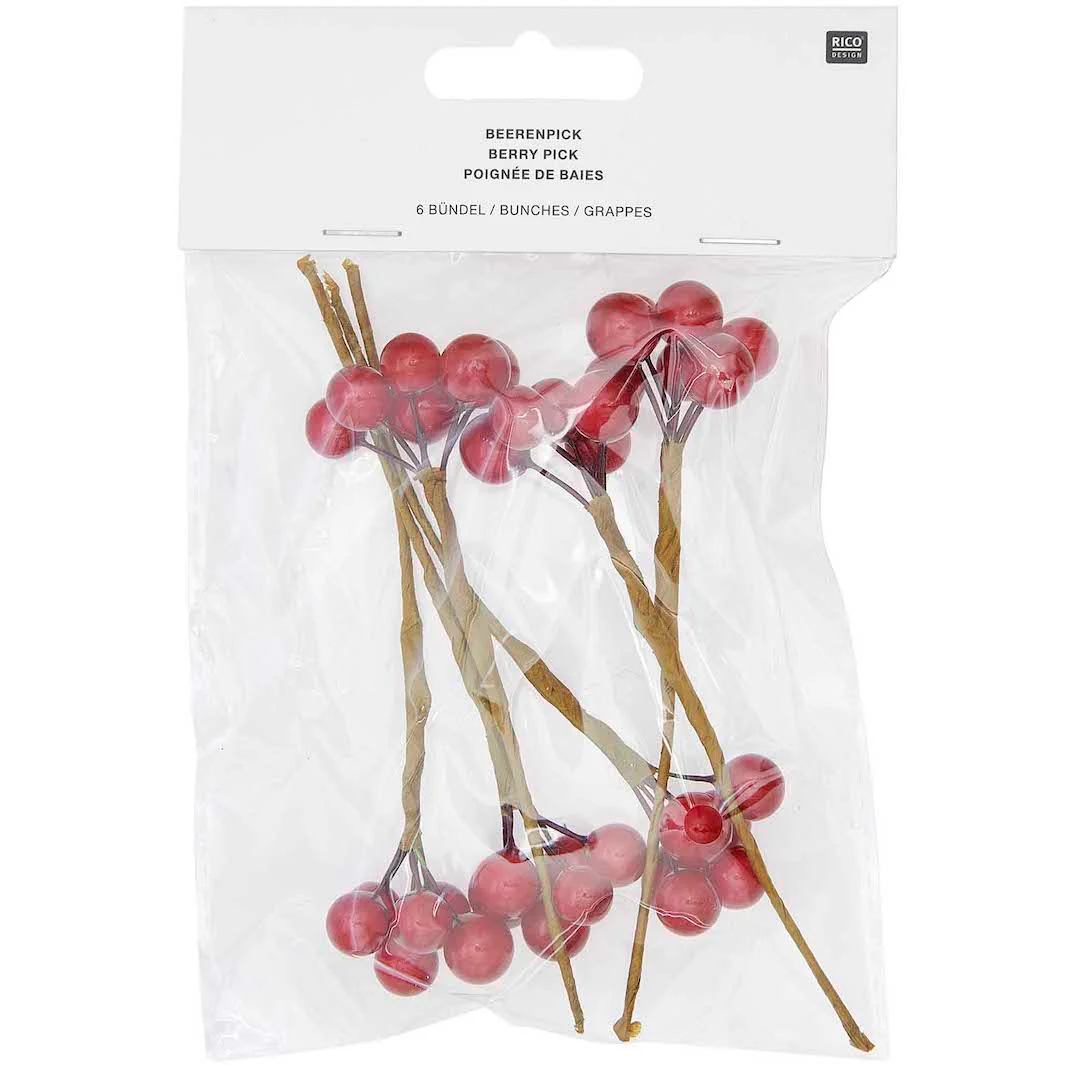 Ce lot contient 6 grappes individuelles de petites baies rouges sur tiges métalliques flexibles.