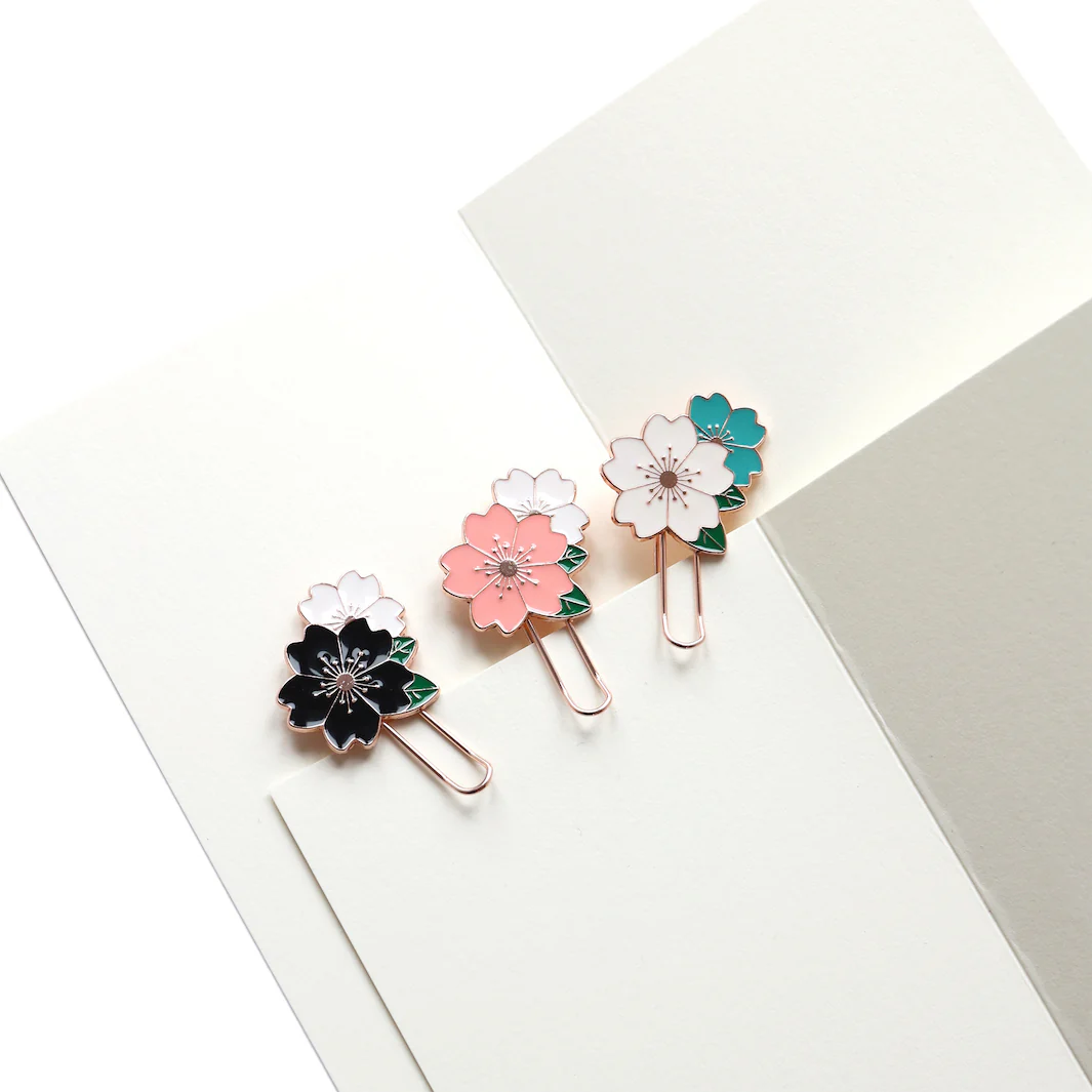 Ce marque-pages en forme de trombone or rose est agrémenté de petites fleurs de cerisier rose moyen et blanches aux feuillages vert foncé.