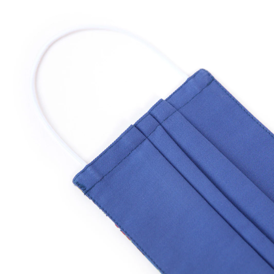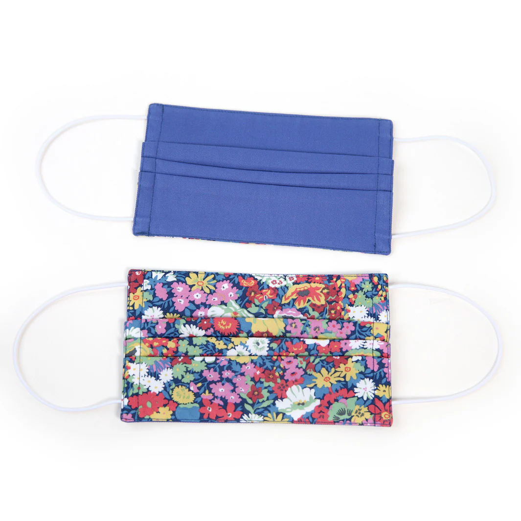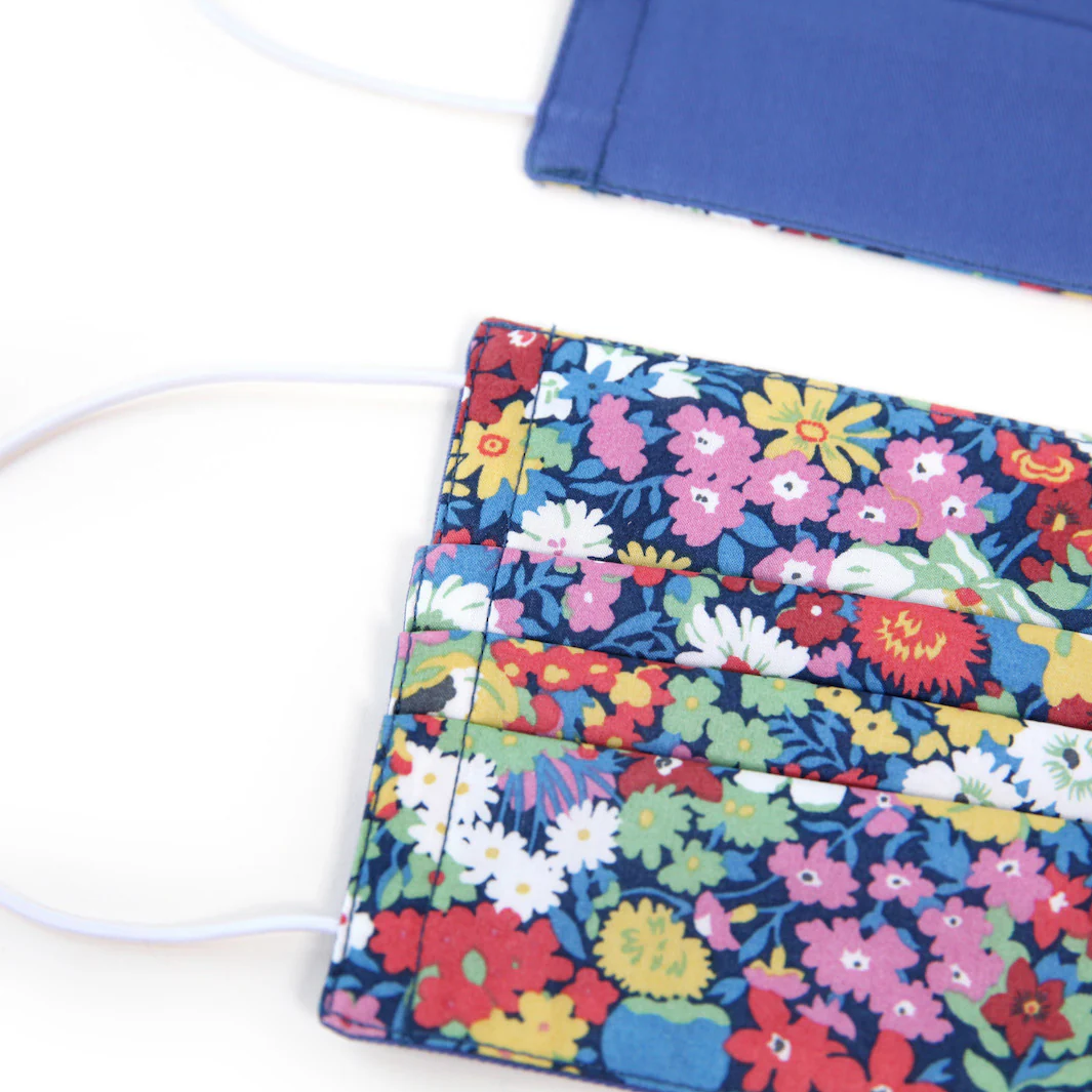 Joli masque en tissus au motif fleuri dans les tons jaunes, roses, rouges, vert et bleu.