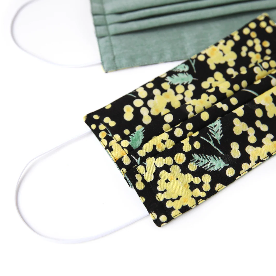Joli masque en tissus au motif de mimosa jaune au feuillage vert sur fond noir