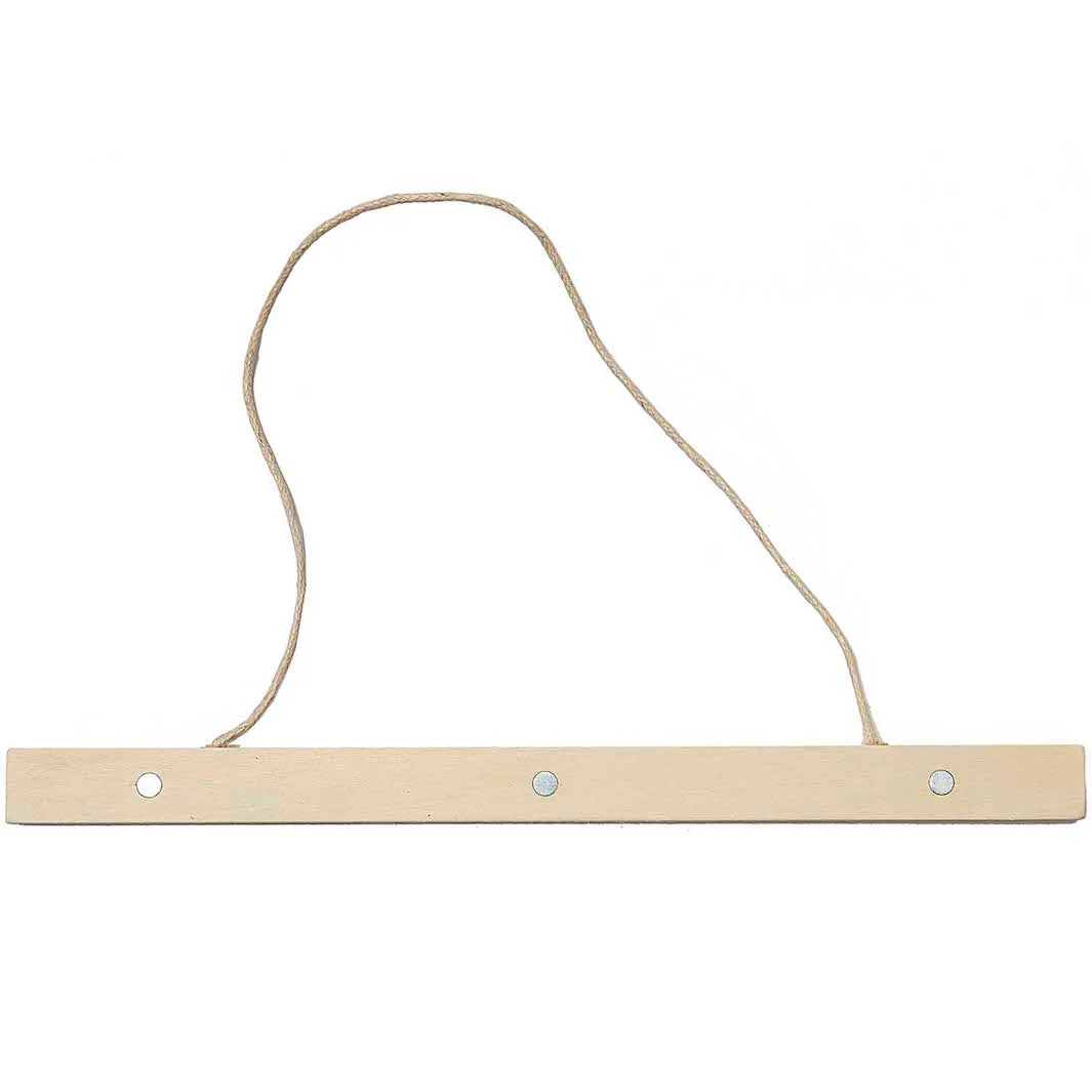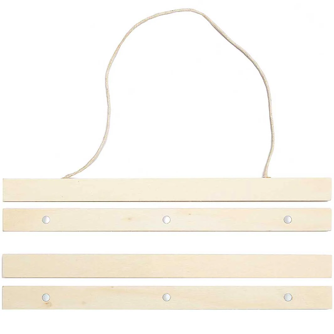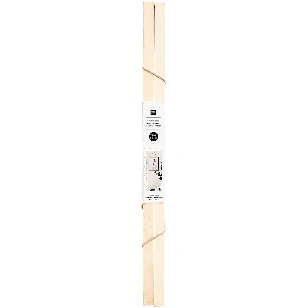 Les tasseaux du haut sont munis d’un lien pour pouvoir accrocher votre affiche. Ce porte-affiche vous permettra de suspendre une affiche A4 en format paysage et une affiche A3 en format portrait.