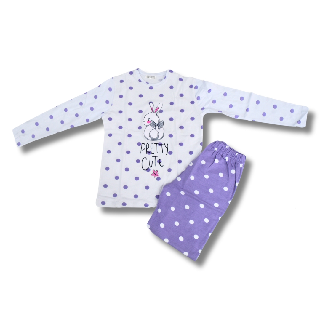 - Haut Blanc à Pois Violets 🌸 : Ce haut à manches longues est décoré de pois violets et d’une illustration adorable d’un lapin souriant, accompagné du texte “PRETTY CUTE” 🥰🐇. Son design ludique et doux capte l’attention des enfants et ajoute une touche de fantaisie.