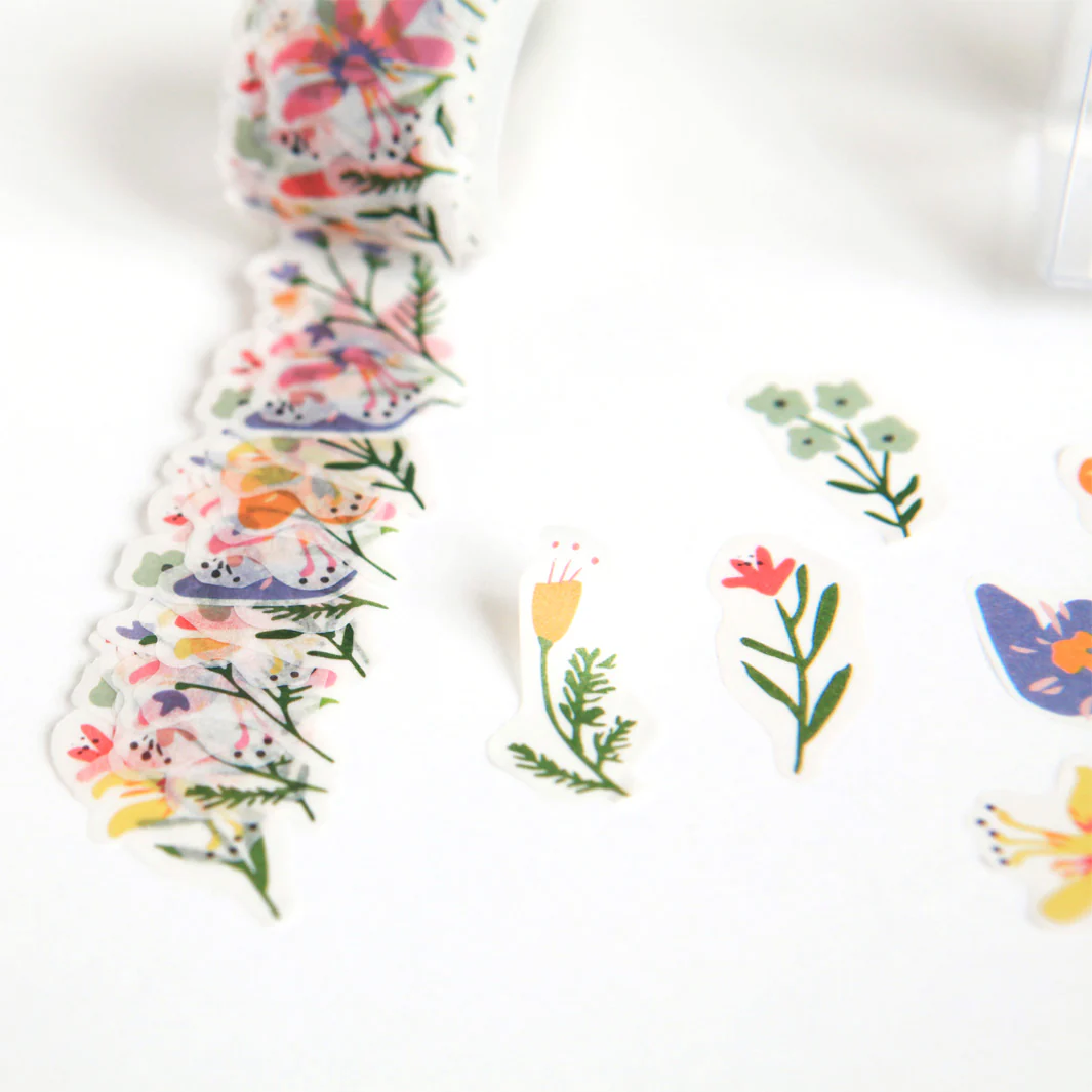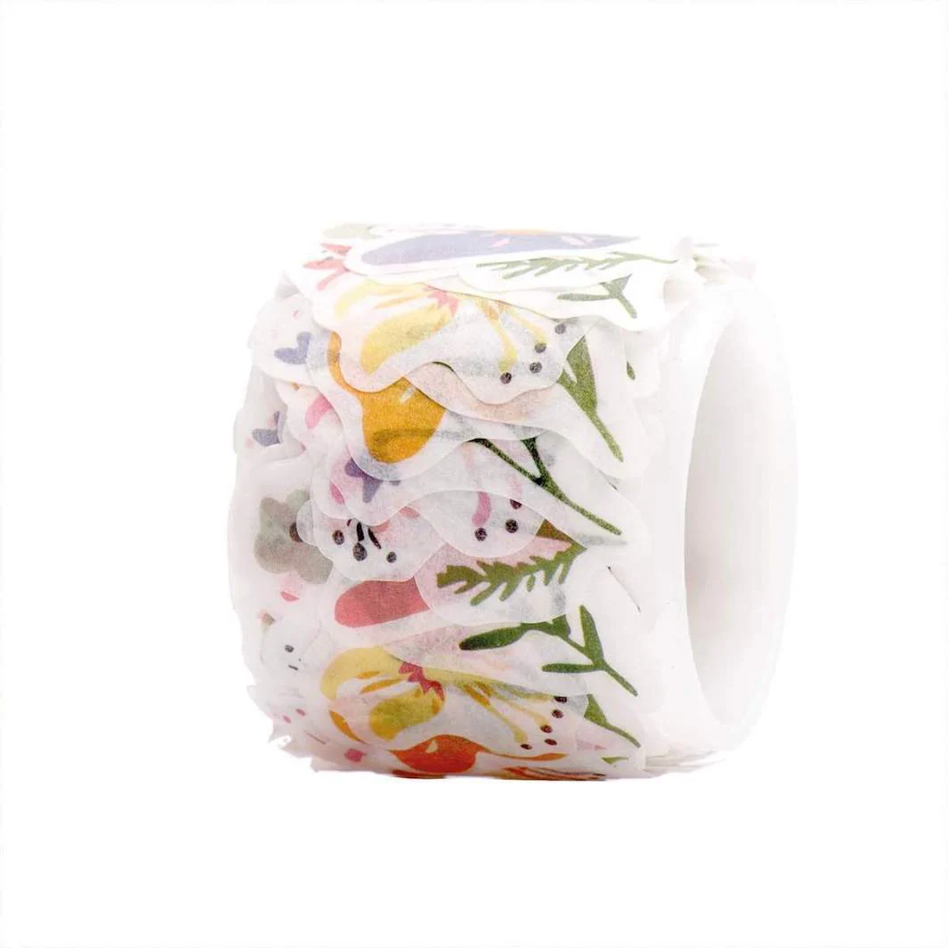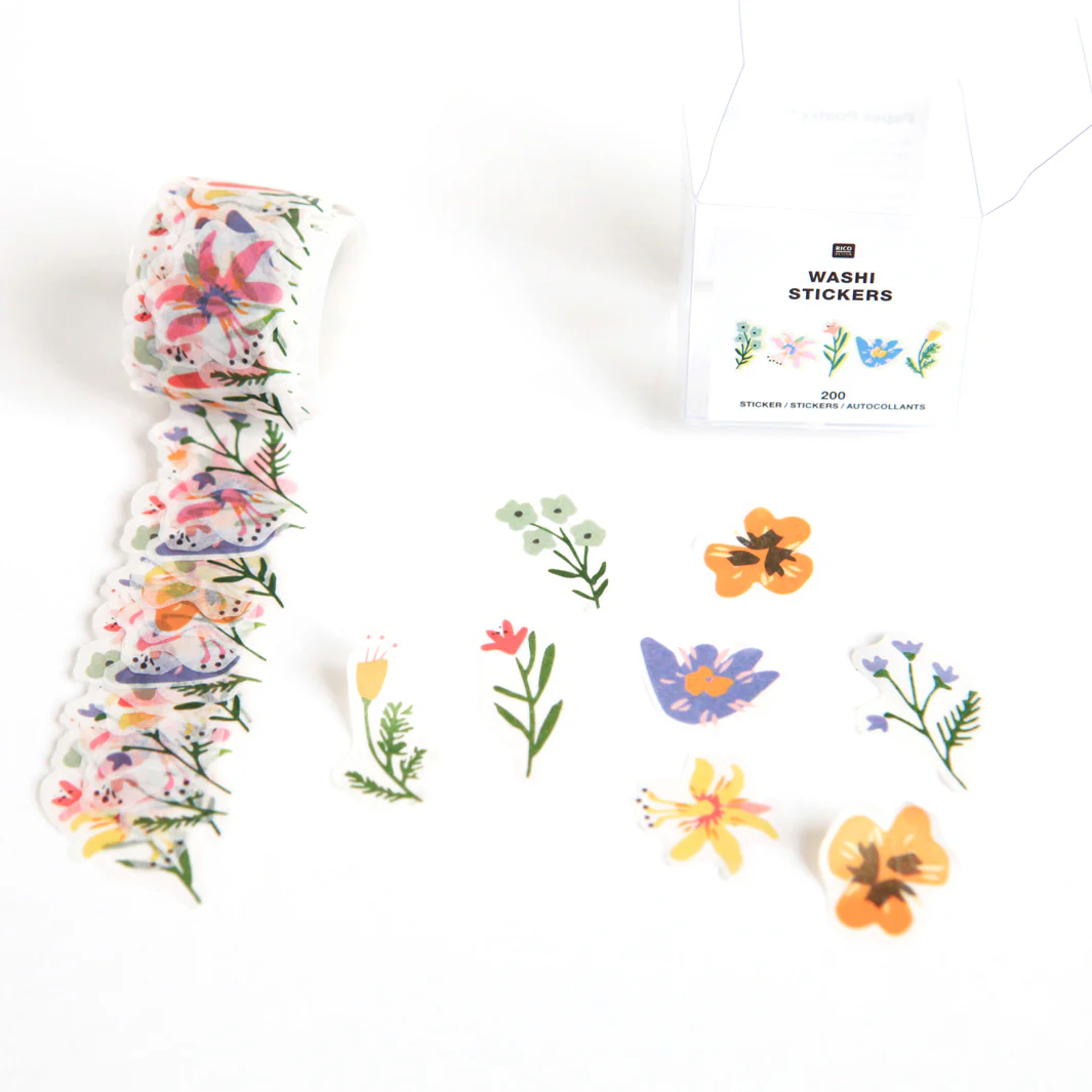 Ce rouleau contient de 200 stickers aux motifs de fleurs multicolores et détails dorés de la gamme Paper Poetry de la marque allemande Rico Design.