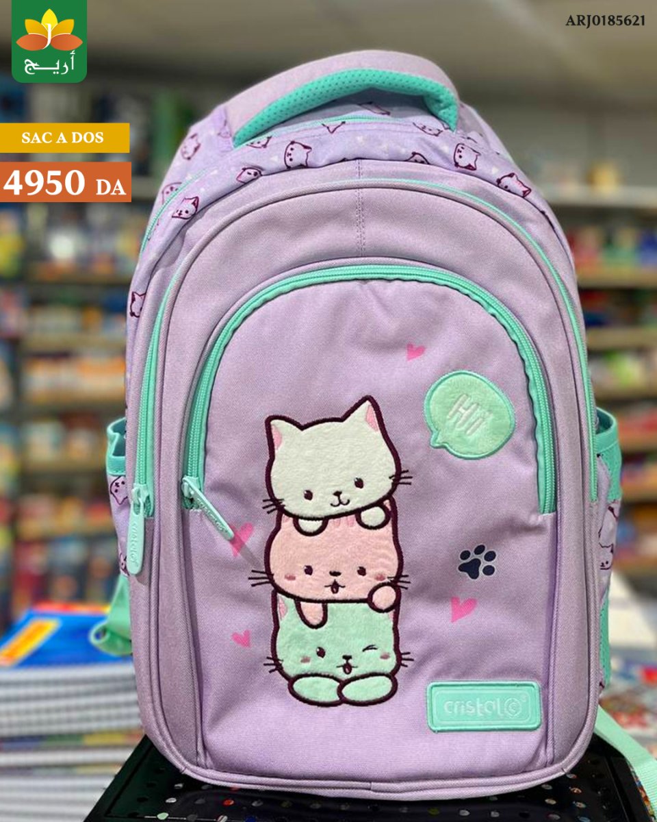 هذه الحقيبة المدرسية مثالية للأطفال المحبين للحيوانات! تصميم لطيف بثلاث قطط مكدسة وقلوب صغيرة يجعلها محبوبة لدى البنات والبنين على حد سواء.