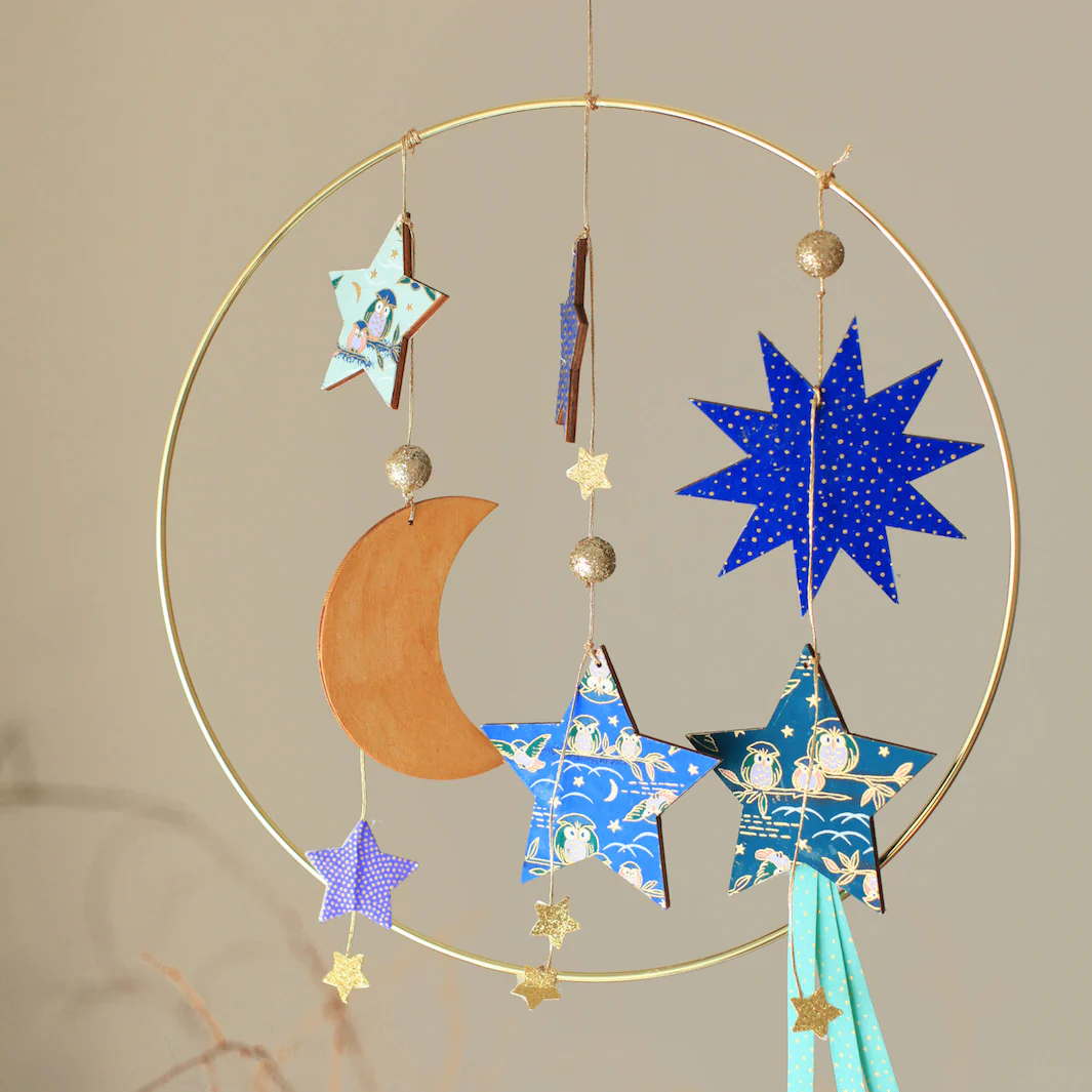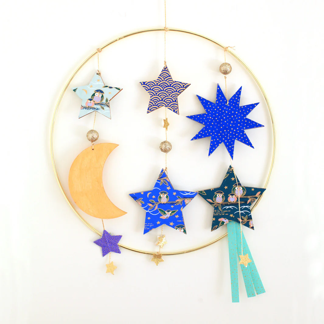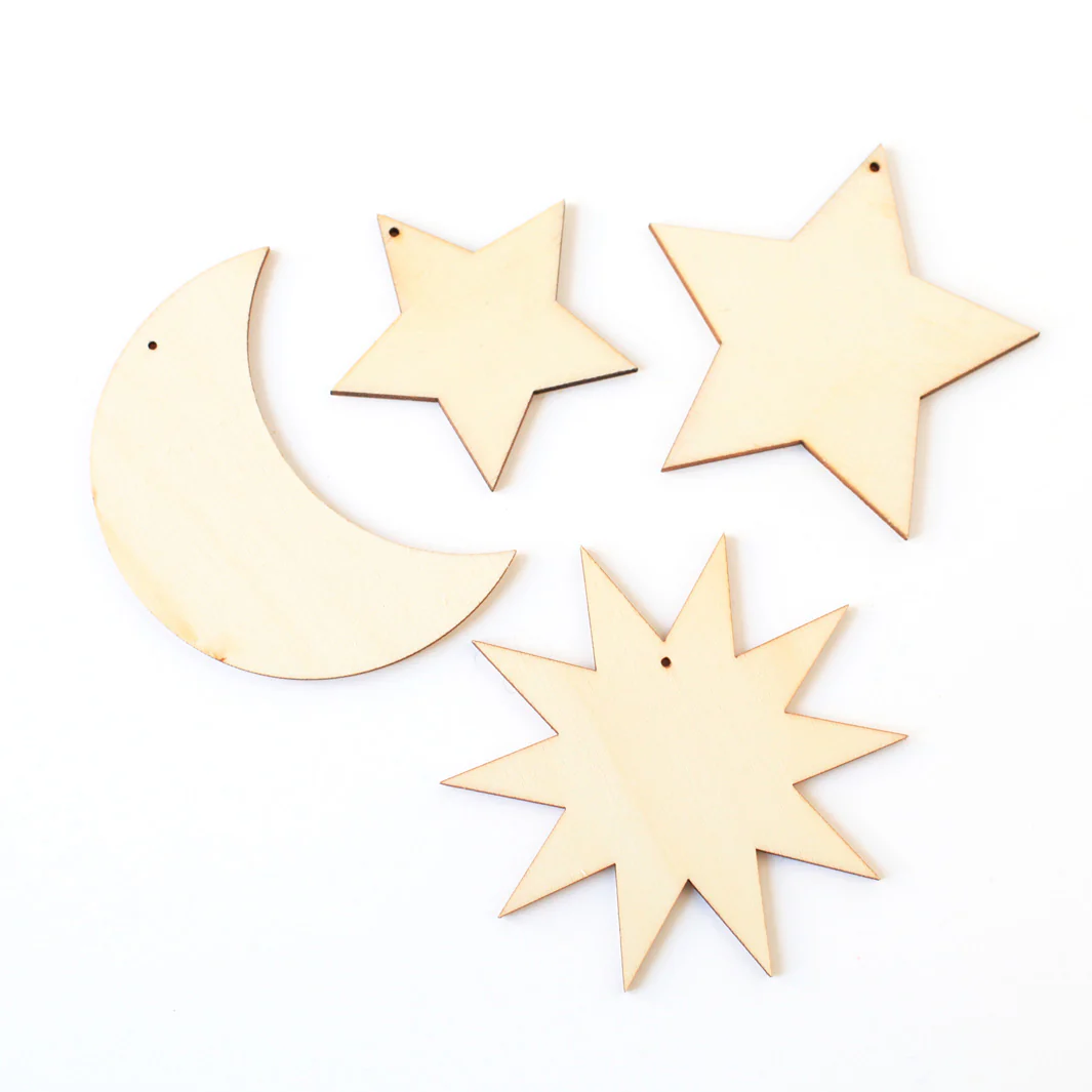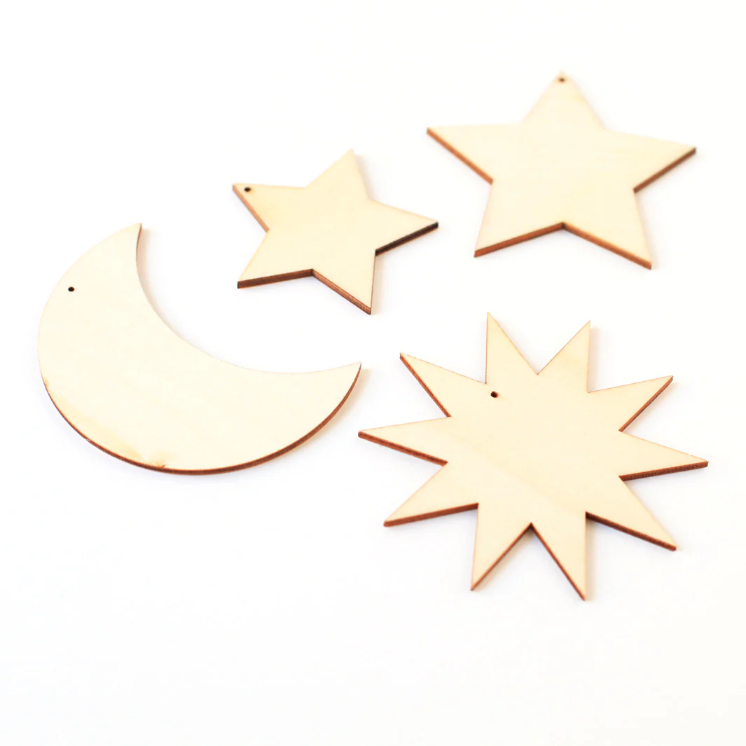 Set de 4 éléments en bois à suspendre. Laisser libre cours à votre imagination en peignant, customisant avec du papier japonais ses jolies décorations en bois. Idéal pour réaliser un mobile, une guirlande à l’esprit céleste !
