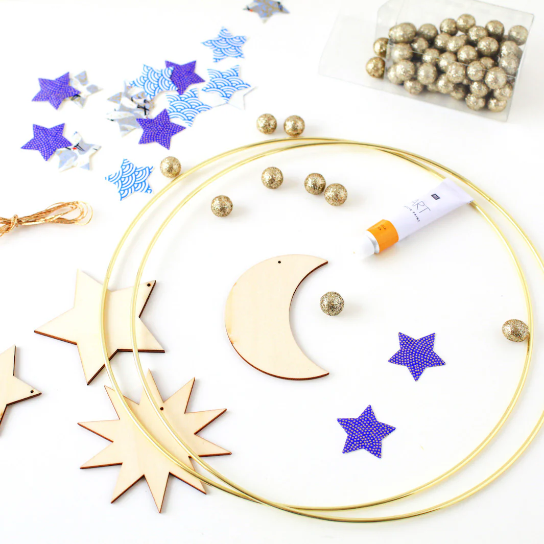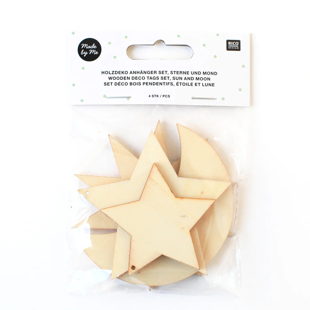 Quantités : 4 éléments en bois (étoiles, soleil et lune)