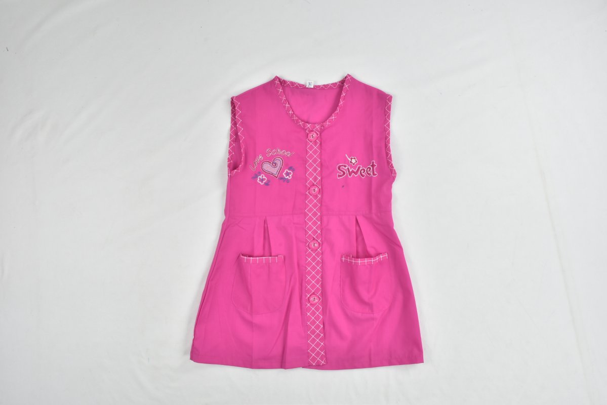 Ce tablier scolaire pour filles est à la fois pratique et mignon, idéal pour les enfants de 6 à 10 ans. De couleur rose vive, il est décoré de jolis motifs brodés : un cœur, des fleurs, et les mots “Love School” et “Sweet”.