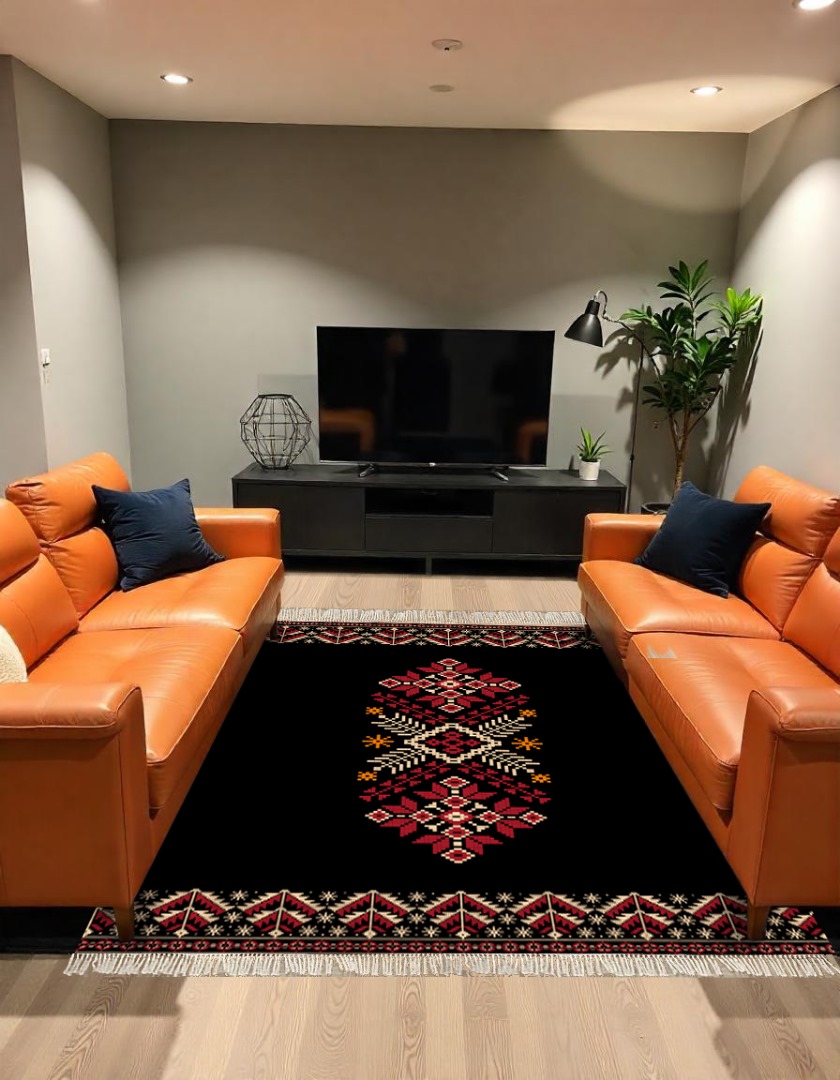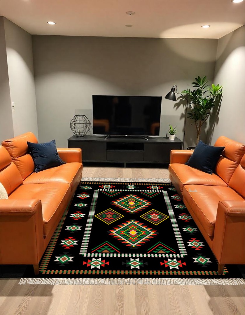 Design : Un tapis élégant avec un fond noir profond, sublimé par des motifs berbères traditionnels en rouge, beige et orange. Son design symétrique apporte une touche authentique et chaleureuse à votre intérieur.