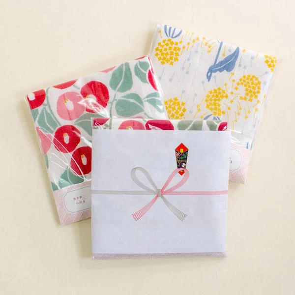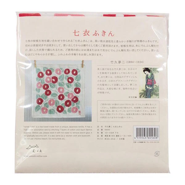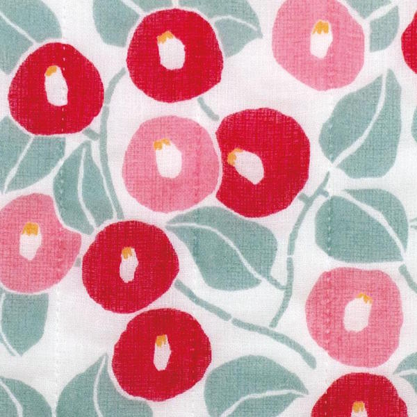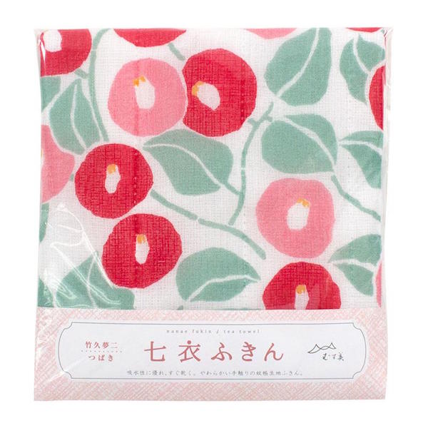 Petit torchon de la marque Musubi avec motif de camélias rouges et roses sur fond blanc.