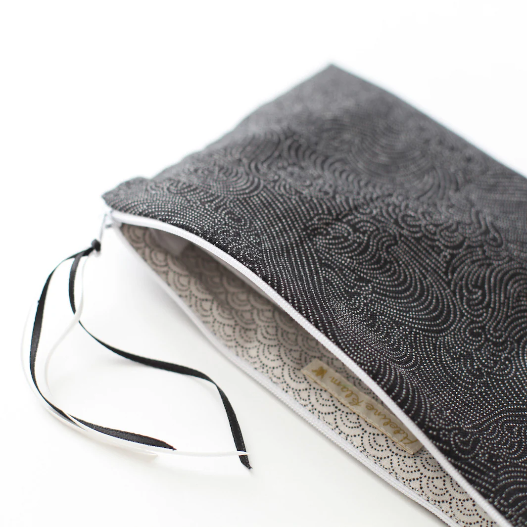 Jolie trousse plate en tissus japonais aux motifs de vagues réalistes en pointillés blancs sur fond bleu noir et vagues graphiques en pointillés noires sur fond blanc, fermeture éclair blanches et liens colorés blancs et noirs.